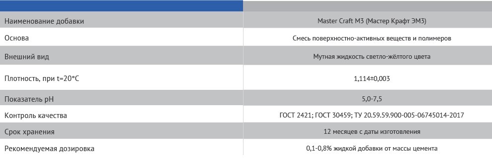 Дозировка «Master Craft M3» устанавливается на основании лабораторных испытаний, для каждого случая индивидуально и может варьироваться как в большую, так и в меньшую сторону, в зависимости от технических задач, предъявляемых к бетону.