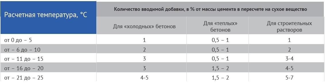 Противоморозная добавка для бетонов и строительных растворов «ПМП» добавляется в воду замеса, или одновременно с ней на стадии приготовления бетона или раствора в стационарных бетонорастворных установках. С увеличением количества вводимой добавки в бетон или раствор, соответственно уменьшается количество расчетной воды затворения. Рекомендуемый расход «ПМП» для большинства составов бетона, можно принять по таблице 1, в зависимости от условий