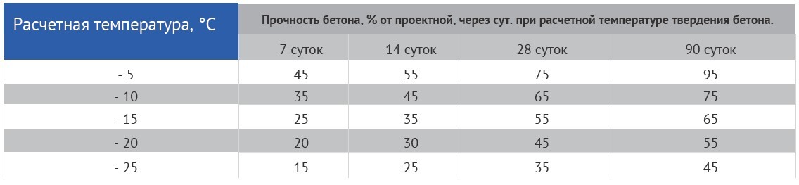Расход добавки, в качестве ускорителя твердения бетонной смеси, составляет в пределах 1,0% - 3,5% готового водного раствора продукта от массы цемента. Рабочую дозировку «ПМП» рекомендуется подбирать опытным путем с учетом всех регламентов по производству продукции. Определение состава бетона, т. е. оптимального соотношения его составляющих: цемента, заполнителей, добавок и воды, производят с учетом следующих факторов: • ожидаемого темпа набора прочности (ориентировочно определяемого по таблице 2, на основании требуемой прочности на сжатие); • гарантированной марки или активности цемента; • требуемой подвижности бетонной смеси; • плотностей материалов для смеси, в т.ч. оптимальных дозировок добавок