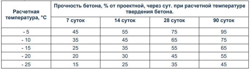 Прочность бетона, с противоморозной добавкой, к моменту его возможного замораживания в конструкции, должна составлять не менее 20% прочности, соответствующей проектному классу бетона.