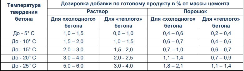 Обеспечивает твердение бетона в условиях отрицательных температур до минус 30°С при соблюдений рекомендаций по применению и производству бетонных работ при отрицательных температурах воздуха - СНиП 3.03.01-87 Минимальный расход добавки по готовому продукту