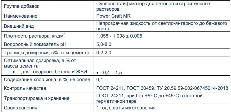 «Power Craft MR» допустимо использовать с воздухововлекающими и противоморозными добавками производства Компании «Chemical Craft». Для получения необходимых свойств бетонной смеси при использовании «Power Craft MR» с добавками других производителей, необходимо провести предварительные лабораторные испытания для оптимизации состава бетонной смеси.