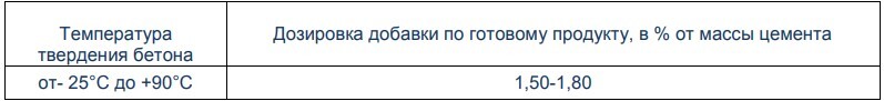 В условиях пониженных и отрицательных температур, рекомендуется соблюдать действующие предписания по бетонированию в зимних условиях. Дозировку добавки необходимо определять экспериментально для достижения минимально возможного водоцементного соотношения. Воду рекомендуется использовать теплую или горячую с температурой не более 70 °С.